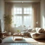 A warm, minimalist living room with a couple sitting together on a simple neutral sofa, holding hands and smiling. A child plays with a wooden toy on the floor nearby. Sunlight floods the space through large windows. The setting is peaceful, joyful, and connected. Ultra-realistic style.